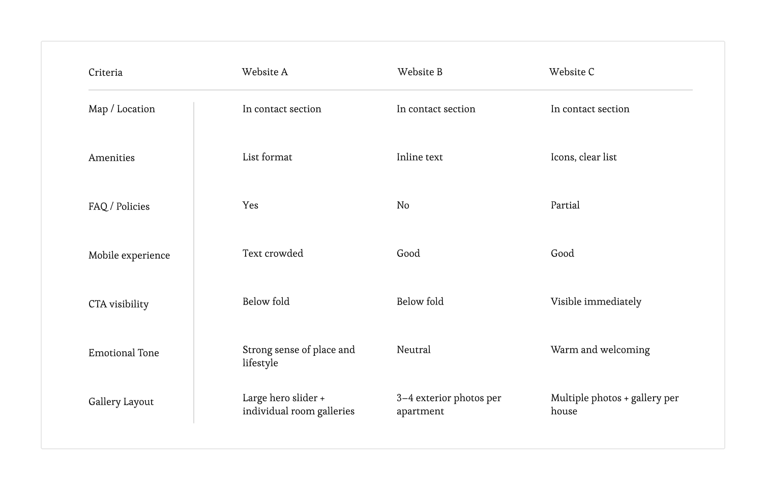 To better understand design patterns and user expectations for small-scale accommodation websites. I analyzed three competitor websites (referred to here as Website A, B, and C) — all representing small-scale Italian vacation rentals — to identify patterns in storytelling, usability, and design.